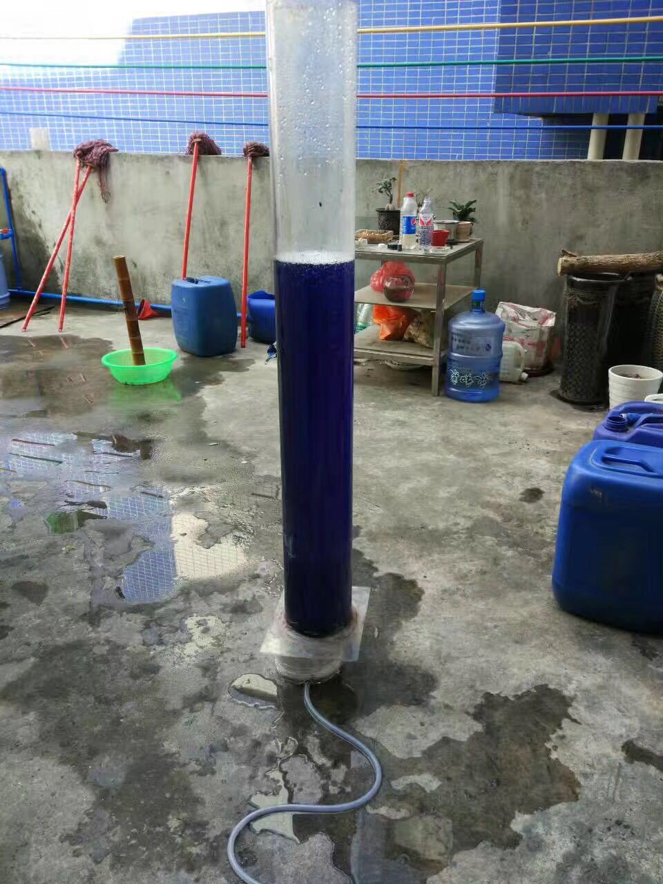 实验后的脱色效果对比,左一是臭氧曝气8分钟的效果,右一是原水