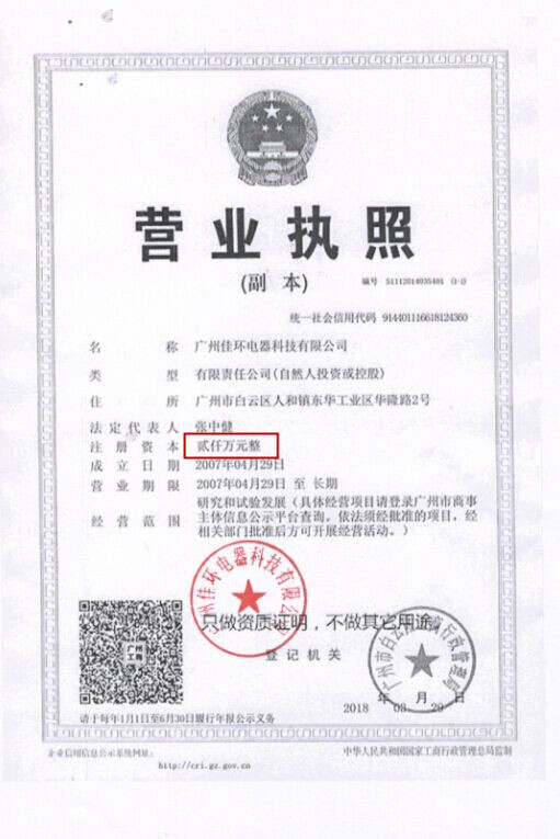 为了公司的发展,广州佳环电器科技有限公司由原来的注册资金30万元正式更改为 2000万元整。